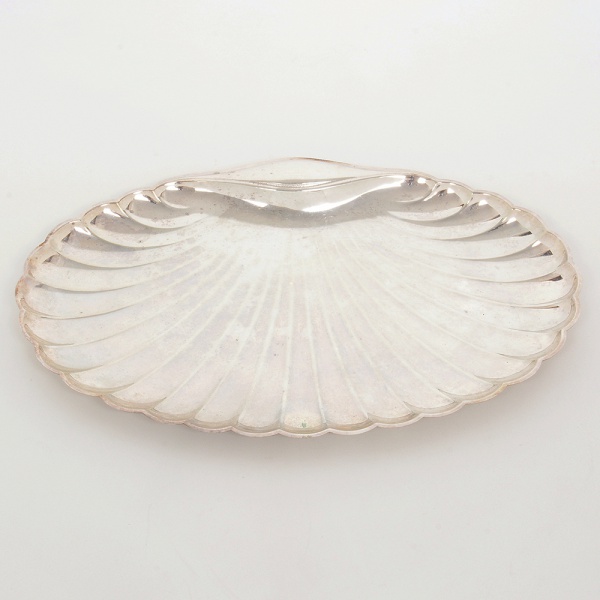 • METAL PRATEADO, um (1) covilhete no formato de concha bivalve, manufatura WOLFF (tradição desde 1894), selo das lojas RACHEL, medindo 29 x 18,5 cm, sinais de uso, vide foto.