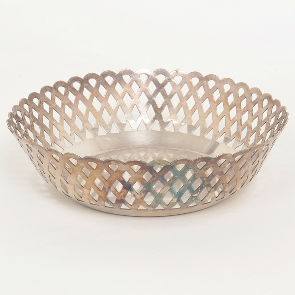 • METAL PRATEADO, uma (1) pequena fruteira, borda vazada em treliças, selo parcialmente legível da manufatura MERIDIONAL, medindo 15 cm diâmetro, sinais de uso, vide foto.