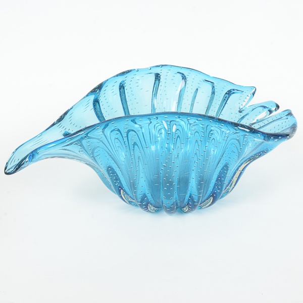 • VIDRO, uma (1) fruteira de Murano, tonalidade azul, translúcida, interior ornado em bulicados, formato de folha,medindo 39,5 x 24,5 x 14 cm, sinais de uso, vide foto.