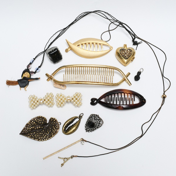 • BIJUTERIAS E OUTROS, treze (13) itens dentre: peanhas, anéis, pingentes, gargantilhas, etc., todos com sinais de uso, vide foto.