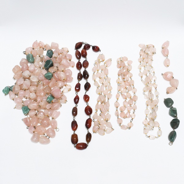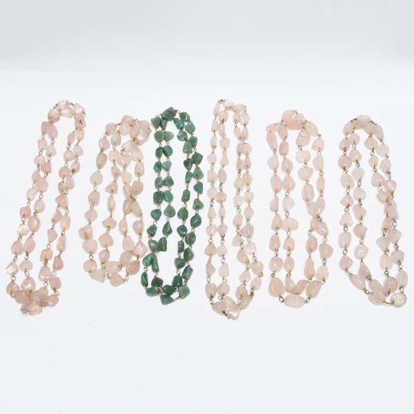• JOIAS, seis (6) colares confeccionados com pedras irregulares e polidas de quartzo verde e rosa, monture em metal vide foto.