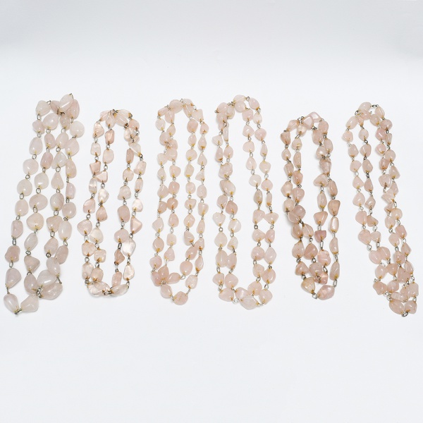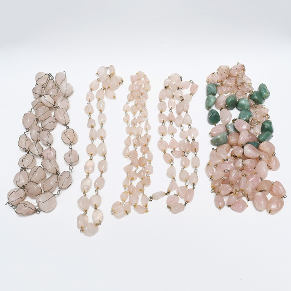 • JOIAS, seis (6) colares confeccionados com pedras irregulares e polidas de quartzo rosa, monture em metal vide foto.
