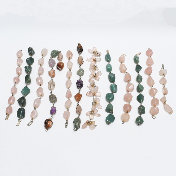 • JOIAS, doze (12) pulseiras confeccionadas com pedras irregulares e polidas de quartzo verde, quartzo rosa e ágata, monture em metal vide foto.