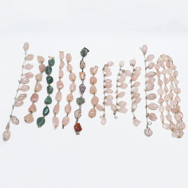 • JOIAS, doze (12) itens: 11 pulseiras e 1 colar, confeccionadas com pedras irregulares e polidas de quartzo verde, quartzo rosa e ágata, monture em metal vide foto.