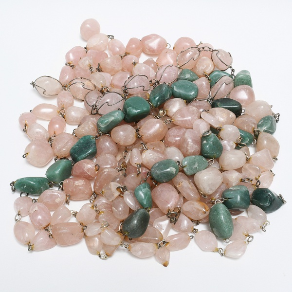 • JOIAS, um (1) saco com diversas contas irregulares e polidas de quartzo verde e rosa, para montagem, vide foto.