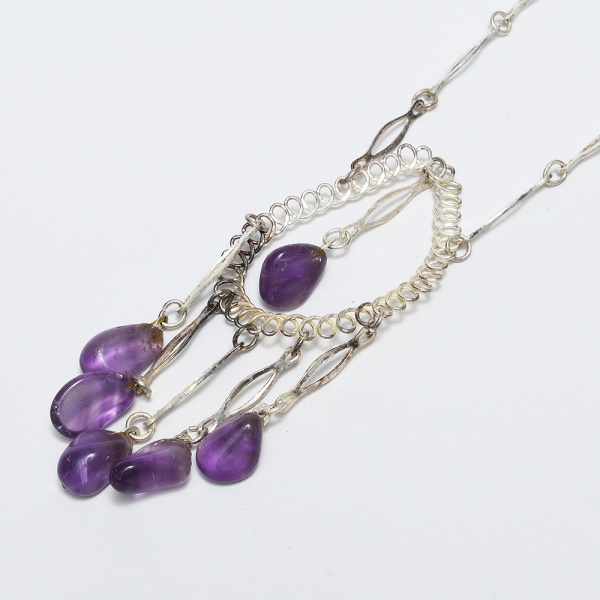 • BIJUTERIA, uma (1) gargantilha com monture em metal prateado com contas irregulares e polidas em ametista, medindo 42 cm, sinais de uso, vide foto.