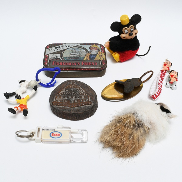 • COLECIONISMO, oito (8) itens: 1 caixa vazia de bala Fisherman s Friend, sinais de oxidação; 1 peso de papel, souvenir de Israel; 1 boneco na forma de Mickey; 5 chaveiros diversos, todos os itens com sinais de uso, vide foto.