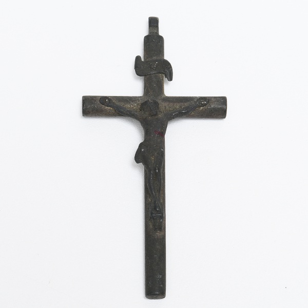 • ARTE SACRA, um (1) antigo pingente/crucifixo em bronze, medindo 7,5 cm, sinais de uso, vide foto.