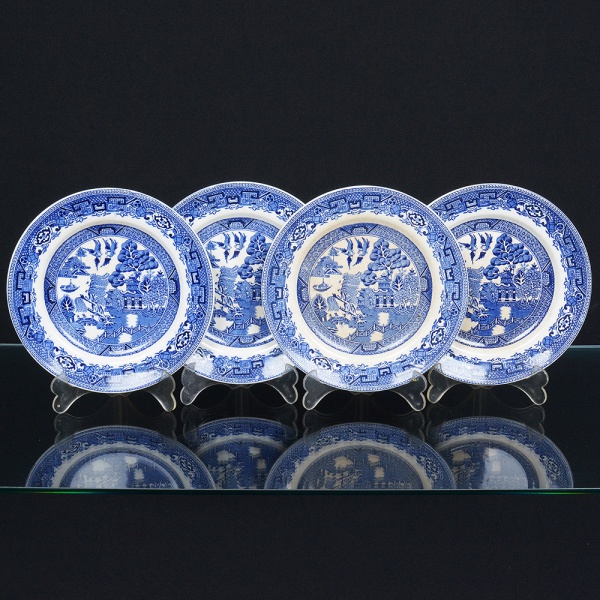 • FAIANÇA INGLESA, quatro (4) pratos de sobremesa, ornamentação dita WILLON (Segundo a lenda chinesa: Um certo Mandarim tinha uma leal e devotada filha, possuidora de rara beleza. Certo dia, em que descobre que ela estava apaixonada por um carteiro que lhe fazia a corte, e que era por ela correspondida, expulsa a filha de casa e roga-lhe uma praga: que ao ser trocado o primeiro beijo pelo casal, eles se transformariam em dois pombos), também conhecida como pombinhos, manufatura WOOD & SONS Ltd. (fundada em 1865, funcionou na Potteries New Wharf em Trent e mais tarde na Pottery Stanley em Burlem, fechou em 2005), tonalidade azul sobre fundo branco, medindo 18 cm diâmetro, possui o craquelê característico do envelhecimento de toda a faiança, sinais de uso, vide foto.