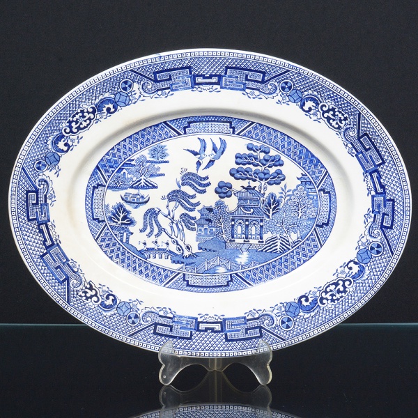 • FAIANÇA INGLESA, uma (1) travessa oval, ornamentação dita WILLON (Segundo a lenda chinesa: Um certo Mandarim tinha uma leal e devotada filha, possuidora de rara beleza. Certo dia, em que descobre que ela estava apaixonada por um carteiro que lhe fazia a corte, e que era por ela correspondida, expulsa a filha de casa e roga-lhe uma praga: que ao ser trocado o primeiro beijo pelo casal, eles se transformariam em dois pombos), também conhecida como pombinhos, manufatura WOOD & SONS Ltd. (fundada em 1865, funcionou na Potteries New Wharf em Trent e mais tarde na Pottery Stanley em Burlem, fechou em 2005), tonalidade azul sobre fundo branco, medindo 33 x 25,5 cm, possui o craquelê característico do envelhecimento de toda a faiança, sinais de uso, vide foto.