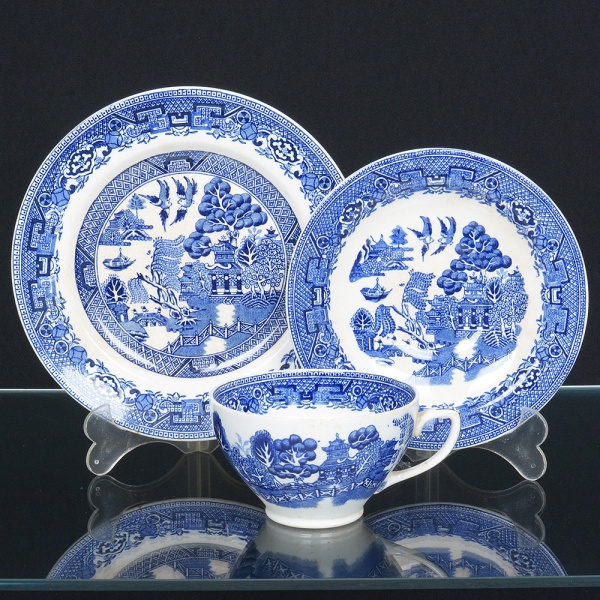 • FAIANÇA INGLESA, um (1) trio para chá (xícara, pires e prato de bolo), ornamentação dita WILLON (Segundo a lenda chinesa: Um certo Mandarim tinha uma leal e devotada filha, possuidora de rara beleza. Certo dia, em que descobre que ela estava apaixonada por um carteiro que lhe fazia a corte, e que era por ela correspondida, expulsa a filha de casa e roga-lhe uma praga: que ao ser trocado o primeiro beijo pelo casal, eles se transformariam em dois pombos), também conhecida como pombinhos, manufatura WOOD & SONS Ltd. (fundada em 1865, funcionou na Potteries New Wharf em Trent e mais tarde na Pottery Stanley em Burlem, fechou em 2005), tonalidade azul sobre fundo branco, medindo a maior peça 18 cm diâmetro, possui o craquelê característico do envelhecimento de toda a faiança, sinais de uso, vide foto.