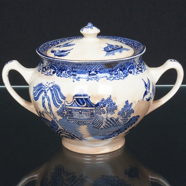 • FAIANÇA INGLESA, um (1) açucareiro com tampa, ornamentação dita WILLON (Segundo a lenda chinesa: Um certo Mandarim tinha uma leal e devotada filha, possuidora de rara beleza. Certo dia, em que descobre que ela estava apaixonada por um carteiro que lhe fazia a corte, e que era por ela correspondida, expulsa a filha de casa e roga-lhe uma praga: que ao ser trocado o primeiro beijo pelo casal, eles se transformariam em dois pombos), também conhecida como pombinhos, manufatura WOOD & SONS Ltd. (fundada em 1865, funcionou na Potteries New Wharf em Trent e mais tarde na Pottery Stanley em Burlem, fechou em 2005), tonalidade azul sobre fundo branco, medindo 12 cm de altura e diâmetro mais as alças, possui o craquelê característico do envelhecimento de toda a faiança, além de manchas, sinais de uso, vide foto.
