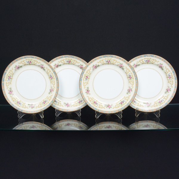 • PORCELANA JAPONESA, quatro (4) pratos rasos, ornamentação floral policromada, borda com faixa na tonalidade azul claro e elementos vegetalistas em policromia, arremates a ouro, manufatura NORITAKE (1858 - Japão assinou o Tratado de Amizade e Comércio com os EUA, Holanda, Rússia, Reino Unido e França; 1867 fim do Shogunato e início da era Meiji; 1876 - Morimura-Kumi formada em Tóquio para exportação Os Morimuras & The Okuras unidos, a Companhia Hinode se estabelece na cidade de Nova York para o varejo; 1879 - A Companhia Hinode fecha. Morimura Bros & Co., se estabelece em Nova York; 1880 - Hiroses juntou-se a Morimura-Kumi em Tóquio; 1882 - Morimura Bros & Co., decidiu ser o atacadista; 1884 Morimura-Kumi subcontrata atelieres de decoração em porcelana nas cidades de Tokyo, Nagoya e Kyoto; 1918 - Morimura-Kumi é reorganizada como Morimura Bros, Inc.; 1921 - Morimura Bros de New York é incorporada a Morimura Bros, Inc. De Tokyo; 1947 - Noritake Co., Inc. com sede em Nova York; 1981 - Nome japonês da Companhia alterado para Noritake Co. Limited), modelo COLBY, medindo 23 cm diâmetro, sinais de uso, vide foto.