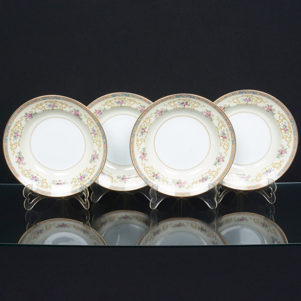 • PORCELANA JAPONESA, quatro (4) pratos fundos, ornamentação floral policromada, borda com faixa na tonalidade azul claro e elementos vegetalistas em policromia, arremates a ouro, manufatura NORITAKE (1858 - Japão assinou o Tratado de Amizade e Comércio com os EUA, Holanda, Rússia, Reino Unido e França; 1867 fim do Shogunato e início da era Meiji; 1876 - Morimura-Kumi formada em Tóquio para exportação Os Morimuras & The Okuras unidos, a Companhia Hinode se estabelece na cidade de Nova York para o varejo; 1879 - A Companhia Hinode fecha. Morimura Bros & Co., se estabelece em Nova York; 1880 - Hiroses juntou-se a Morimura-Kumi em Tóquio; 1882 - Morimura Bros & Co., decidiu ser o atacadista; 1884 Morimura-Kumi subcontrata atelieres de decoração em porcelana nas cidades de Tokyo, Nagoya e Kyoto; 1918 - Morimura-Kumi é reorganizada como Morimura Bros, Inc.; 1921 - Morimura Bros de New York é incorporada a Morimura Bros, Inc. De Tokyo; 1947 - Noritake Co., Inc. com sede em Nova York; 1981 - Nome japonês da Companhia alterado para Noritake Co. Limited), modelo COLBY, medindo 23 cm diâmetro, sinais de uso, vide foto.