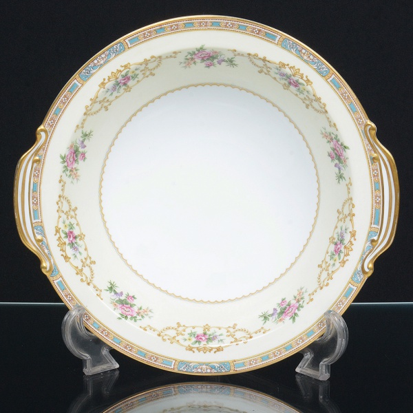 • PORCELANA JAPONESA, uma (1) saladeira tipo bowl, ornamentação floral policromada, borda com faixa na tonalidade azul claro e elementos vegetalistas em policromia, arremates a ouro, manufatura NORITAKE (1858 - Japão assinou o Tratado de Amizade e Comércio com os EUA, Holanda, Rússia, Reino Unido e França; 1867 fim do Shogunato e início da era Meiji; 1876 - Morimura-Kumi formada em Tóquio para exportação Os Morimuras & The Okuras unidos, a Companhia Hinode se estabelece na cidade de Nova York para o varejo; 1879 - A Companhia Hinode fecha. Morimura Bros & Co., se estabelece em Nova York; 1880 - Hiroses juntou-se a Morimura-Kumi em Tóquio; 1882 - Morimura Bros & Co., decidiu ser o atacadista; 1884 Morimura-Kumi subcontrata atelieres de decoração em porcelana nas cidades de Tokyo, Nagoya e Kyoto; 1918 - Morimura-Kumi é reorganizada como Morimura Bros, Inc.; 1921 - Morimura Bros de New York é incorporada a Morimura Bros, Inc. De Tokyo; 1947 - Noritake Co., Inc. com sede em Nova York; 1981 - Nome japonês da Companhia alterado para Noritake Co. Limited), modelo COLBY, medindo 25,5 cm diâmetro mais as alças e 7 cm altura, sinais de uso, vide foto.