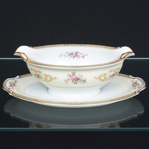 • PORCELANA JAPONESA, uma (1) molheira com presentoir acoplado, ornamentação floral policromada, borda com faixa na tonalidade azul claro e elementos vegetalistas em policromia, arremates a ouro, manufatura NORITAKE (1858 - Japão assinou o Tratado de Amizade e Comércio com os EUA, Holanda, Rússia, Reino Unido e França; 1867 fim do Shogunato e início da era Meiji; 1876 - Morimura-Kumi formada em Tóquio para exportação Os Morimuras & The Okuras unidos, a Companhia Hinode se estabelece na cidade de Nova York para o varejo; 1879 - A Companhia Hinode fecha. Morimura Bros & Co., se estabelece em Nova York; 1880 - Hiroses juntou-se a Morimura-Kumi em Tóquio; 1882 - Morimura Bros & Co., decidiu ser o atacadista; 1884 Morimura-Kumi subcontrata atelieres de decoração em porcelana nas cidades de Tokyo, Nagoya e Kyoto; 1918 - Morimura-Kumi é reorganizada como Morimura Bros, Inc.; 1921 - Morimura Bros de New York é incorporada a Morimura Bros, Inc. De Tokyo; 1947 - Noritake Co., Inc. com sede em Nova York; 1981 - Nome japonês da Companhia alterado para Noritake Co. Limited), modelo COLBY, medindo 23,5 x 15,5 x 8 cm, sinais de uso, vide foto.