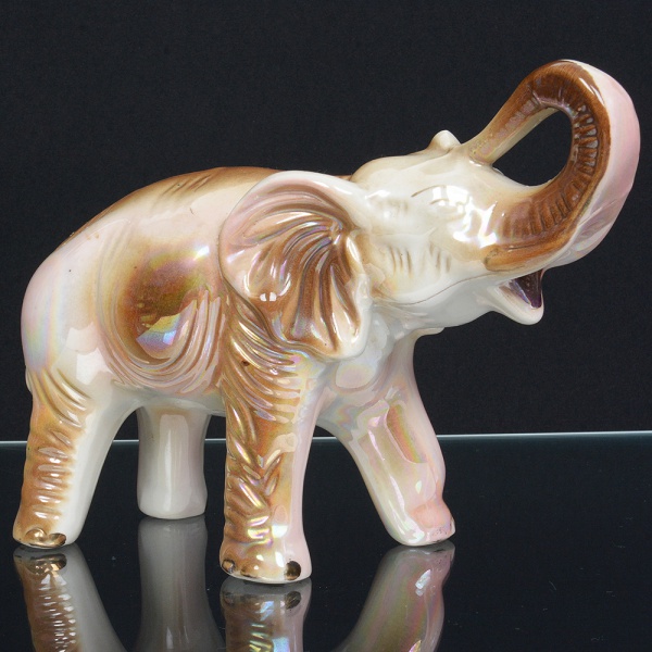 • ESCULTURA, uma (1) representando elefante, confeccionada em louça, ornamentação policromada pintada a mão e perolizada, sem marca de manufatura aparente, medindo 19 cm comprimento, vide foto.