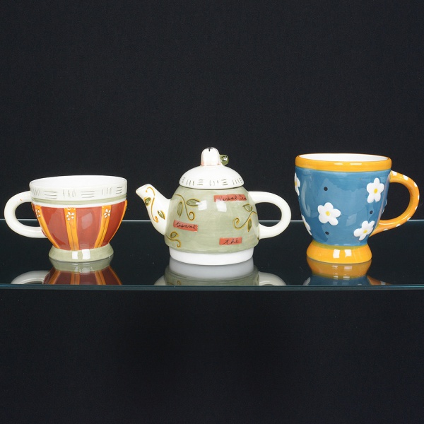 • FAIANÇA, três (3) itens policromados, pintados a mão: 1 bule com tampa, detalhes vegetalistas e legenda, medindo 12 cm altura; 2 canecas distintas, relevadas em flores e frisos, medindo 11 cm diâmetro e 8,5 cm altura; 10,5 cm diâmetro e 11 cm altura, todos os itens com sinais de uso, vide foto.