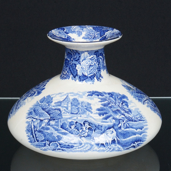 • FAIANÇA, um (1) vaso floreiro com base cônica, gargalo terminando em corneto, ornamentação dita fazendinha, representando paisagem rural e elementos vegetalistas, manufatura WOOD & SONS Ltd. (fundada em 1865, funcionou na Potteries New Wharf em Trent e mais tarde na Pottery Stanley em Burlem, fechou em 2005), modelo ENOCH WOOD S ENGLISH SCENERY, medindo 21 cm diâmetro e 14,5 cm altura,  possui o craquelê característico do envelhecimento de toda a faiança, sinais de uso, vide foto.