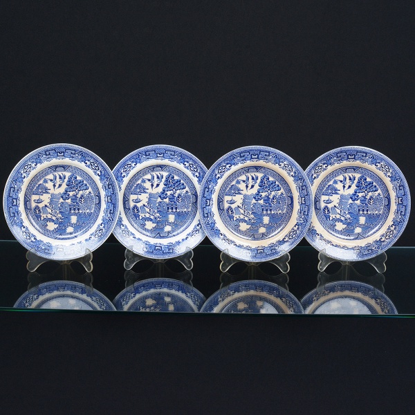 • FAIANÇA INGLESA, quatro (4) pratos de sobremesa, ornamentação dita WILLON (Segundo a lenda chinesa: Um certo Mandarim tinha uma leal e devotada filha, possuidora de rara beleza. Certo dia, em que descobre que ela estava apaixonada por um carteiro que lhe fazia a corte, e que era por ela correspondida, expulsa a filha de casa e roga-lhe uma praga: que ao ser trocado o primeiro beijo pelo casal, eles se transformariam em dois pombos), também conhecida como pombinhos, manufatura WOOD & SONS Ltd. (fundada em 1865, funcionou na Potteries New Wharf em Trent e mais tarde na Pottery Stanley em Burlem, fechou em 2005), tonalidade azul sobre fundo branco, medindo 18 cm diâmetro, possui o craquelê característico do envelhecimento de toda a faiança, sinais de uso, vide foto.
