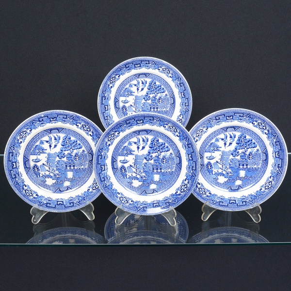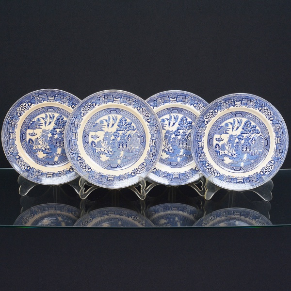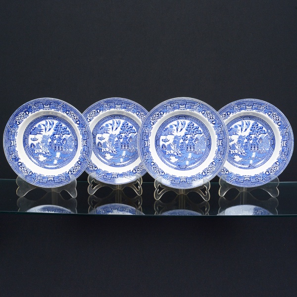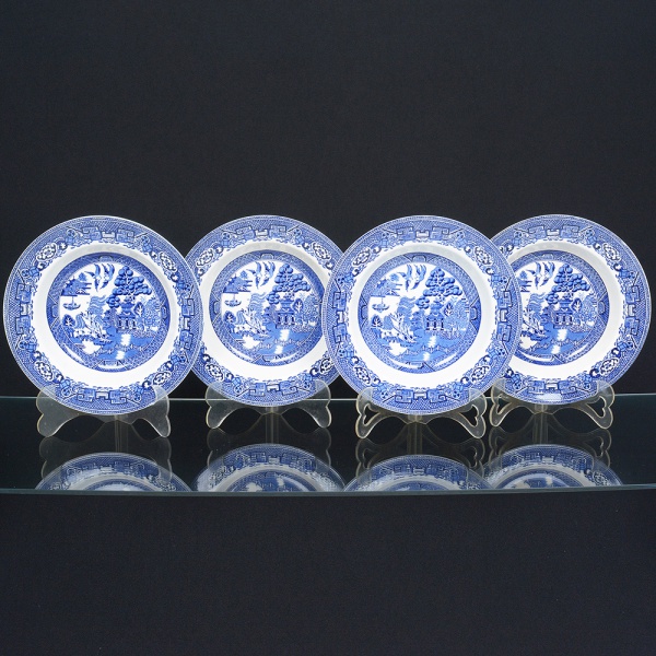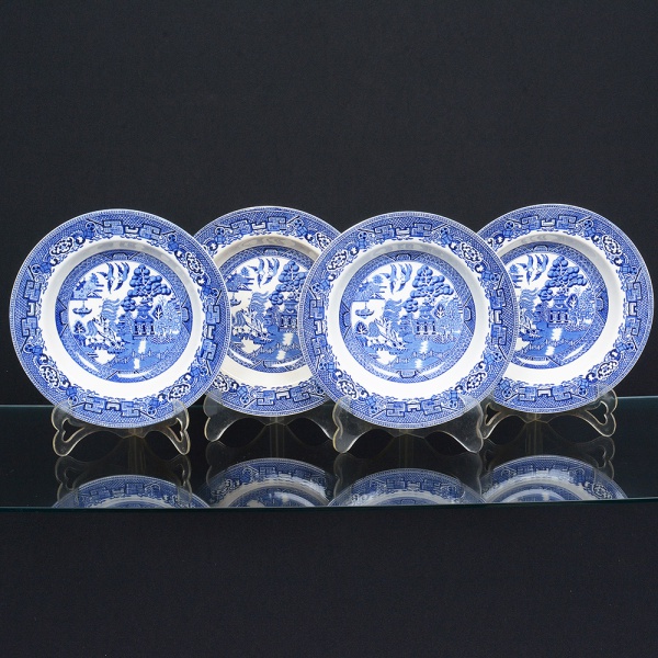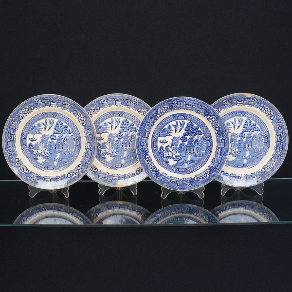 • FAIANÇA INGLESA, quatro (4) pratos rasos, ornamentação dita WILLON (Segundo a lenda chinesa: Um certo Mandarim tinha uma leal e devotada filha, possuidora de rara beleza. Certo dia, em que descobre que ela estava apaixonada por um carteiro que lhe fazia a corte, e que era por ela correspondida, expulsa a filha de casa e roga-lhe uma praga: que ao ser trocado o primeiro beijo pelo casal, eles se transformariam em dois pombos), também conhecida como pombinhos, manufatura WOOD & SONS Ltd. (fundada em 1865, funcionou na Potteries New Wharf em Trent e mais tarde na Pottery Stanley em Burlem, fechou em 2005), tonalidade azul sobre fundo branco, medindo 23 cm diâmetro, possui o craquelê característico do envelhecimento de toda a faiança, sinais de uso, vide foto.
