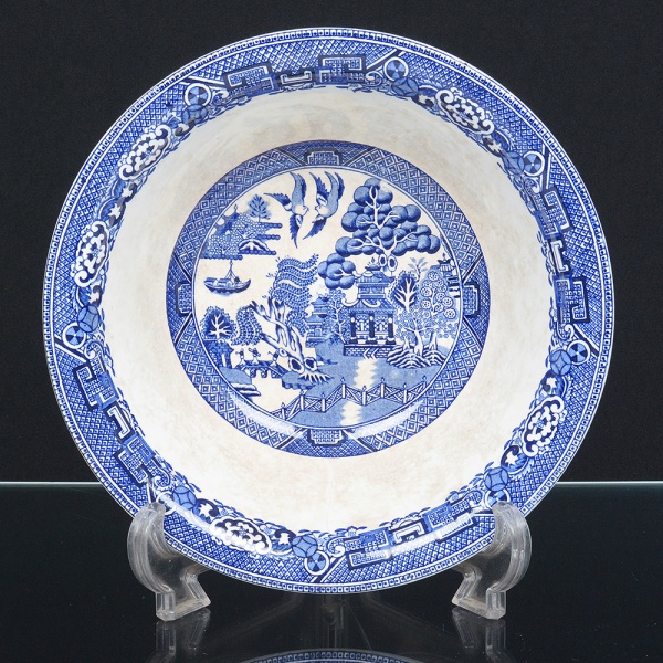 • FAIANÇA INGLESA, uma (1) saladeira tipo bowl, ornamentação dita WILLON (Segundo a lenda chinesa: Um certo Mandarim tinha uma leal e devotada filha, possuidora de rara beleza. Certo dia, em que descobre que ela estava apaixonada por um carteiro que lhe fazia a corte, e que era por ela correspondida, expulsa a filha de casa e roga-lhe uma praga: que ao ser trocado o primeiro beijo pelo casal, eles se transformariam em dois pombos), também conhecida como pombinhos, manufatura WOOD & SONS Ltd. (fundada em 1865, funcionou na Potteries New Wharf em Trent e mais tarde na Pottery Stanley em Burlem, fechou em 2005), tonalidade azul sobre fundo branco, medindo 23,5 cm diâmetro, trincado na borda, possui o craquelê característico do envelhecimento de toda a faiança, sinais de uso, vide foto.