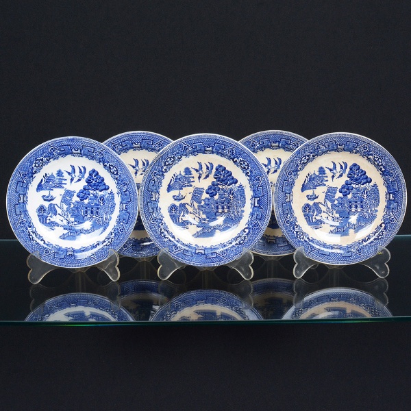 • FAIANÇA INGLESA, cinco (5) pires descasados sem as xícaras, ornamentação dita WILLON (Segundo a lenda chinesa: Um certo Mandarim tinha uma leal e devotada filha, possuidora de rara beleza. Certo dia, em que descobre que ela estava apaixonada por um carteiro que lhe fazia a corte, e que era por ela correspondida, expulsa a filha de casa e roga-lhe uma praga: que ao ser trocado o primeiro beijo pelo casal, eles se transformariam em dois pombos), também conhecida como pombinhos, manufatura WOOD & SONS Ltd. (fundada em 1865, funcionou na Potteries New Wharf em Trent e mais tarde na Pottery Stanley em Burlem, fechou em 2005), tonalidade azul sobre fundo branco, medindo 15 cm diâmetro, possuem o craquelê característico do envelhecimento de toda a faiança, sinais de uso, vide foto.