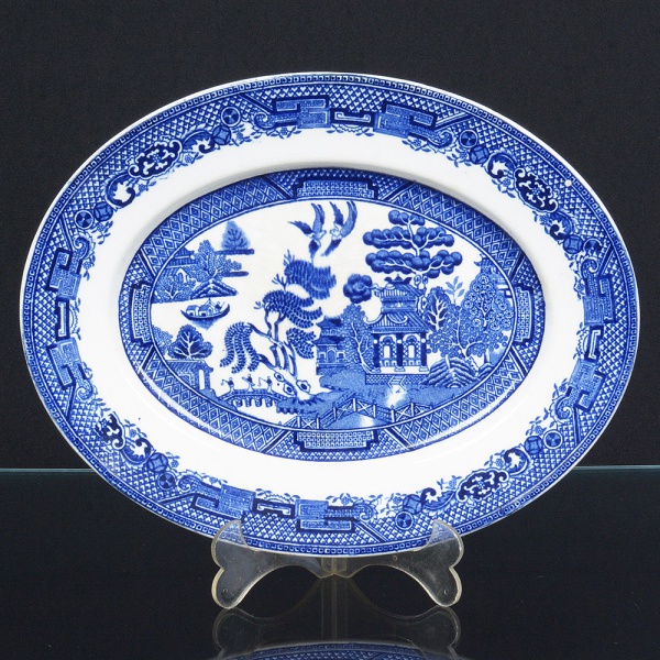 • FAIANÇA INGLESA, uma (1) travessa oval, ornamentação dita WILLON (Segundo a lenda chinesa: Um certo Mandarim tinha uma leal e devotada filha, possuidora de rara beleza. Certo dia, em que descobre que ela estava apaixonada por um carteiro que lhe fazia a corte, e que era por ela correspondida, expulsa a filha de casa e roga-lhe uma praga: que ao ser trocado o primeiro beijo pelo casal, eles se transformariam em dois pombos), também conhecida como pombinhos, manufatura WOOD & SONS Ltd. (fundada em 1865, funcionou na Potteries New Wharf em Trent e mais tarde na Pottery Stanley em Burlem, fechou em 2005), tonalidade azul sobre fundo branco, medindo 26 x 20 cm, possui o craquelê característico do envelhecimento de toda a faiança, sinais de uso, vide foto.