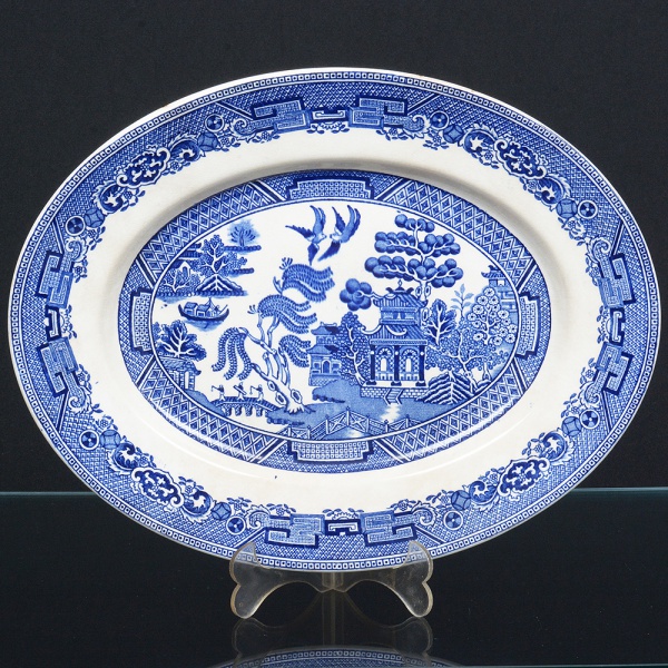 • FAIANÇA INGLESA, uma (1) travessa oval, ornamentação dita WILLON (Segundo a lenda chinesa: Um certo Mandarim tinha uma leal e devotada filha, possuidora de rara beleza. Certo dia, em que descobre que ela estava apaixonada por um carteiro que lhe fazia a corte, e que era por ela correspondida, expulsa a filha de casa e roga-lhe uma praga: que ao ser trocado o primeiro beijo pelo casal, eles se transformariam em dois pombos), também conhecida como pombinhos, manufatura WOOD & SONS Ltd. (fundada em 1865, funcionou na Potteries New Wharf em Trent e mais tarde na Pottery Stanley em Burlem, fechou em 2005), tonalidade azul sobre fundo branco, medindo 31 x 24 cm, raspados na borda visto pelo verso, possui o craquelê característico do envelhecimento de toda a faiança, sinais de uso, vide foto.