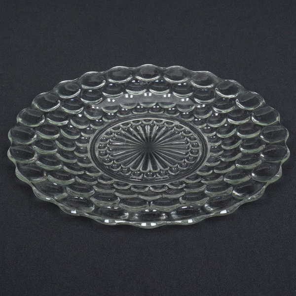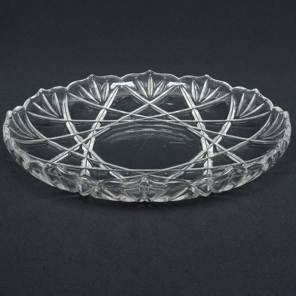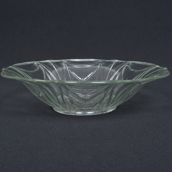• VIDRO, uma (1) fruteira, incolor e translúcida, moldada em sulcos formando padrões geométricos, fundo em flor, medindo 30 cm diâmetro e 8 cm altura, sinais de uso, vide foto.