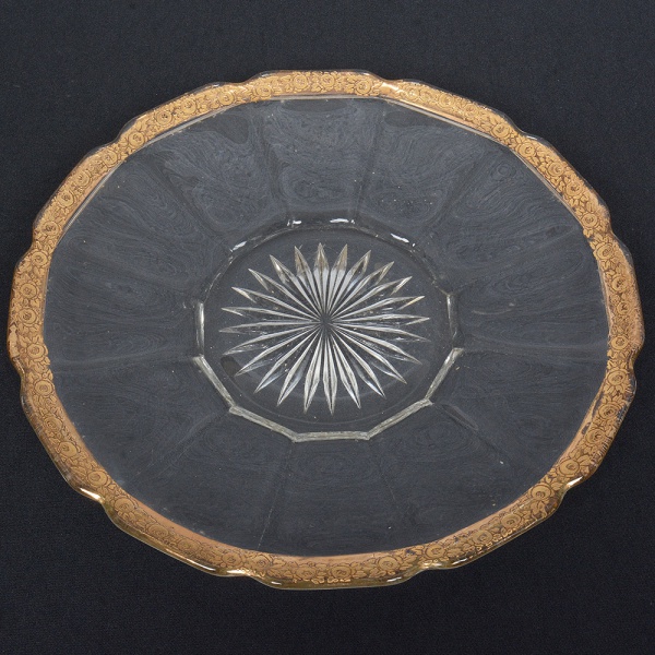 • CRISTAL, uma (1) fruteira, incolor e translúcida, moldada em gomos, fundo estrelado, borda com arremates a ouro representando flores, pequenas falhas na douração, medindo 24,5 cm diâmetro, sinais de uso, vide foto.