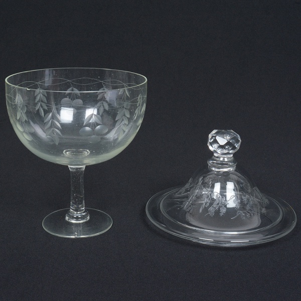 • VIDRO, uma (1) compoteira de pé alto, incolor e translúcida com tampa adaptada, bojo com singela lapidação vegetalista, fuste quase cilíndrico, base em bolacha, tampa com ornamentação floral pirografada, pega facetada com sinais de que foi relapidada, medindo 25 cm altura, sinais de uso, vide foto.