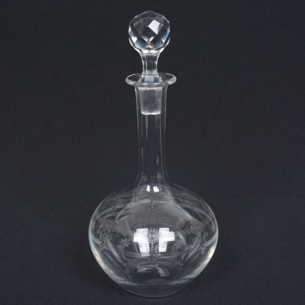 • VIDRO, uma (1) licoreira, incolor e translúcida, com tampa facetada, bojo pirografado, medindo 28 cm altura, traz lascado no gargalo, sinais de uso, vide foto.