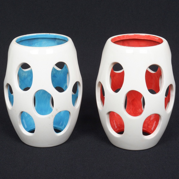 • FAIANÇA OU CERÂMICA, par (2) adornos vazados ou mangas para luminária, pintadas nas tonalidades branca e vermelha em uma e branca e azul em outra, sem marca de manufatura aparente, formato de barrica, medindo 14 cm altura, sinais de uso, vide foto.
