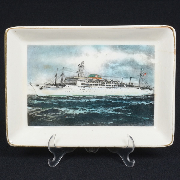 • FAIANÇA, um (1) covilhete retangular, ornamentação policromada, representando navio S. S. Brasil, pequena trinca e bicado na borda, arremates com frisos a ouro com sinais de desgaste, medindo 19 x 13,5 cm, vide foto.