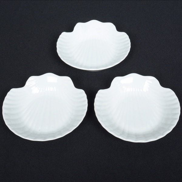 • PORCELANA, três (3) petisqueiras ou base para casquinha de siri, tonalidade branca, formato de concha de vieira, sem marca de manufatura aparente, medindo 13 x 13 cm, sinais de uso, vide foto.