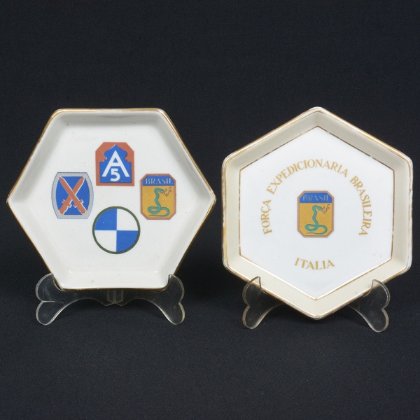 • MILITARIA EM PORCELANA ITALIANA, dois (2) covilhetes hexagonais, ornamentação policromada com símbolo da Força Expedicionária Brasileira (cobra fumando), manufatura RICHARD GINORI, arremates a ouro, sinais de gasto, medindo 14,5 cm diâmetro, vide foto.