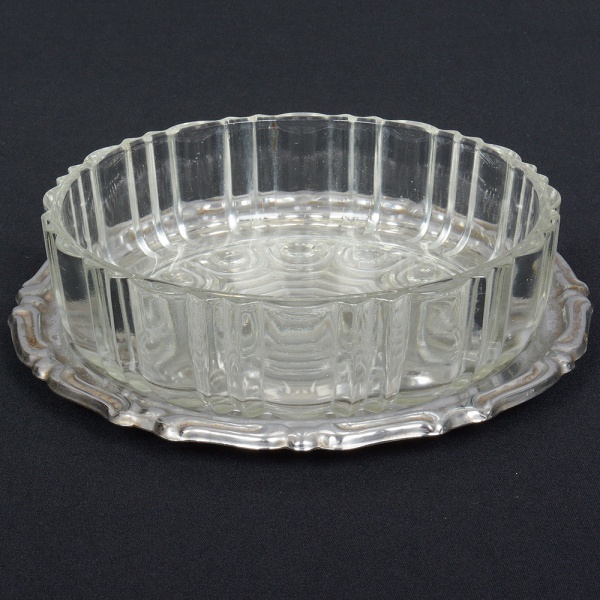 • VIDRO E AÇO INOX, dois (2) itens: 1 fruteira, incolor e translúcida, modelagem geometrizada, medindo 18 cm diâmetro e 5 cm altura, acompanha presentoir com borda relevada em volutas, sem marca de manufatura aparente, confecção mecanizada na técnica de estamparia, medindo 20 cm diâmetro, ambos com sinais de uso, vide foto.