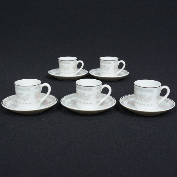 • PORCELANA, cinco (5) xícaras para café com seis pires, ornamentação floral policromada em tons pasteis, arremates com frisos prateados, manufatura SCHMIDT (Pomerode, SC; Mauá, SP; Campo Largo, PR, fundada em 1945, ainda em atividade, maior fábrica de porcelana da América Latina), sinais de uso, vide foto.