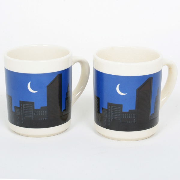 • FAIANÇA INGLESA, par (2) canecas ornadas com silhueta de paisagem noturna metropolitana, tonalidades azul e preta sobre fundo branco, medindo 9,5 cm altura, vide foto.