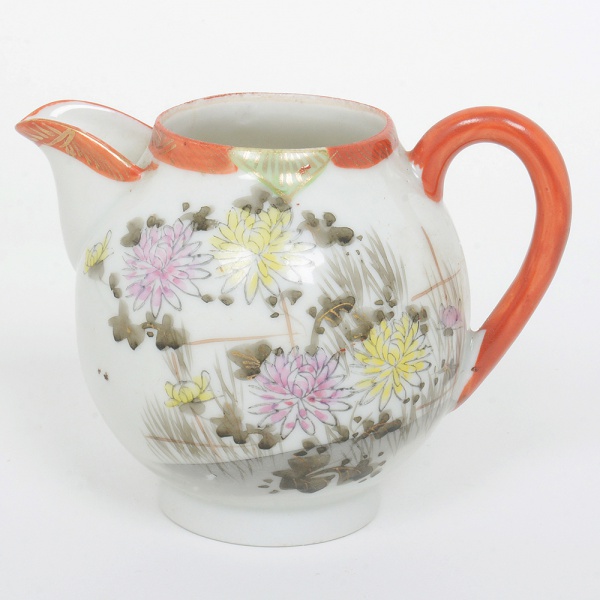 • PORCELANA JAPONESA, uma (1) cremeira com ornamentação policromada pintada a mão no padrão Imari, representando paisagem com flores, montanhas, lago, pagodes, etc., marcado em caracteres dentro de um círculo, medindo 10 cm altura, sinais de uso, vide foto.