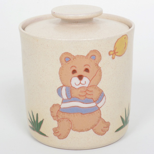 • CERÂMICA, um (1) pote com tampa, esmaltação vítrea policromada, representando urso, medindo 13,5 cm altura e 11,5 cm diâmetro, sem marca de manufatura aparente, sinais de uso, vide foto.