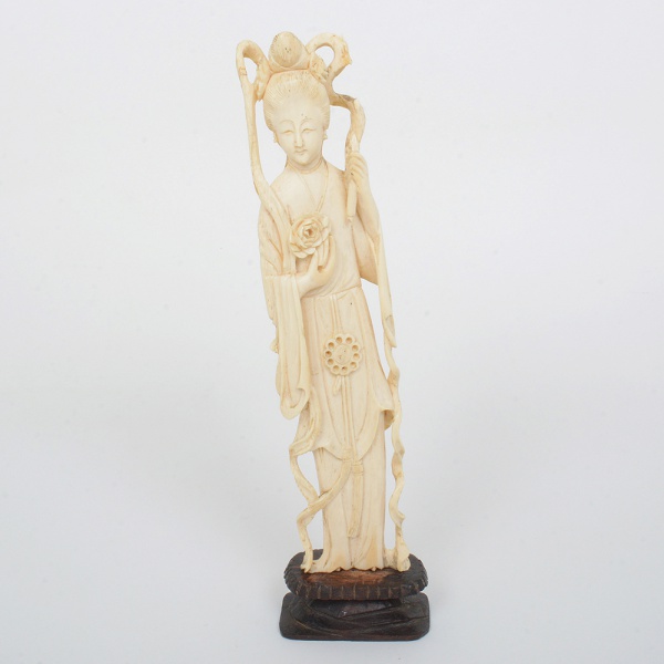 • ESCULTURA, uma (1) figurativa, entalhada em marfim, representando gueixa, objeto na mão esquerda quebrado e faltando, base em  madeira, medindo 22 cm altura, vide foto.