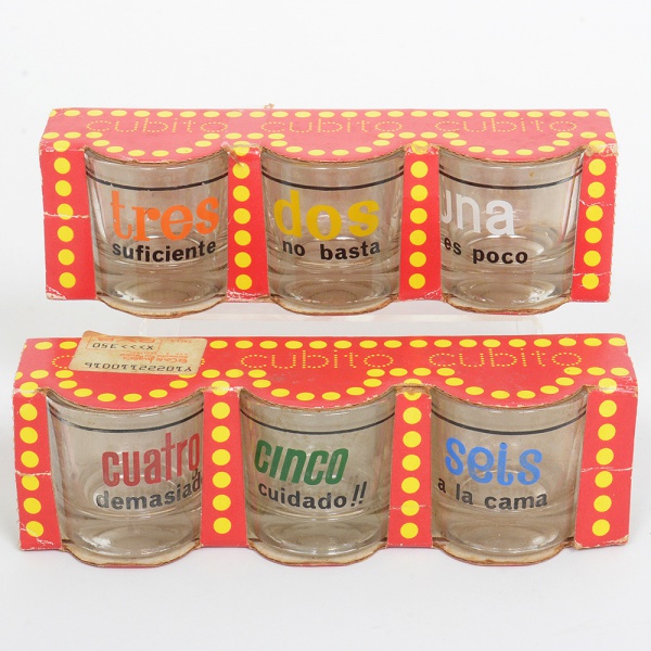 • VIDRO, seis (6) copos de vidro, incolores e translúcidos, quase cilíndricos, legendas em espanhol, não aparentam terem sido usados, marca CUBITO, medindo 5 cm altura, vide foto.