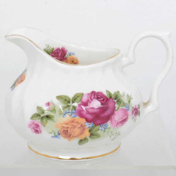 • PORCELANA INGLESA, uma (1) cremeira modelada em gomos espiralados, ornamentação floral policromada, arremates com frisos a ouro, encimada por barco a vela, modelo Blue Waters of England, manufatura STAFFORDSHIRE, medindo 7 cm altura até a alça, sinais de uso, vide foto.