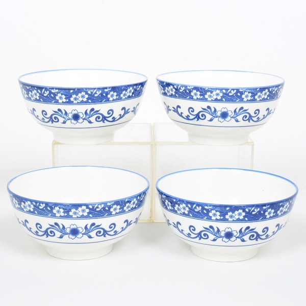 • PORCELANA, quatro (4) tigelas com ornamentação representando flores de cerejeira na tonalidade azul sobre fundo branco, sem marca de manufatura aparente, medindo 15,5 cm diâmetro e 7,5 cm altura, algumas com pequenos defeitos na base, sinais de uso, vide foto.