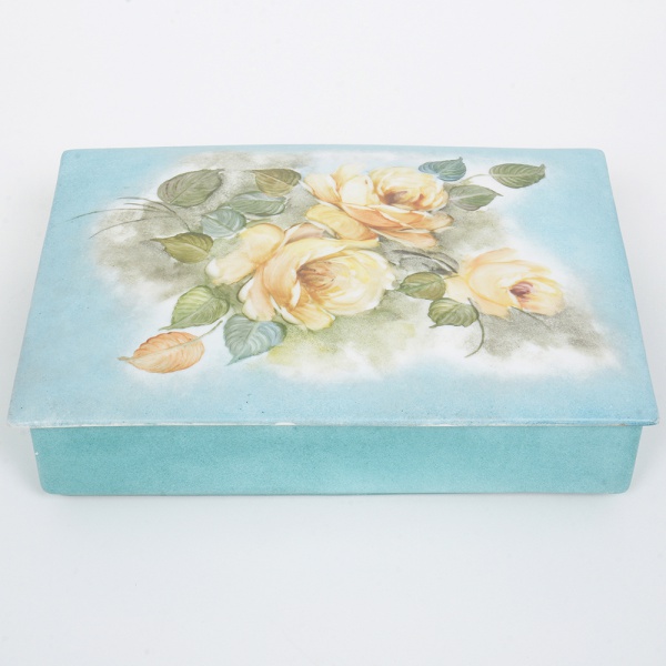 • PORCELANA, uma (1) caixa retangular com tampa, manufatura PORBRAS (Guarulhos, SP, anos 60 até 1991), ornamentação pintada a mão em policromia, representando rosas sobre fundo na tonalidade azul, atelier de decoração ZAIRA, datado e localizado RIO 22-3-1970, medindo 21,5 x 15,5 x 5,5 cm, sinais de uso, vide foto.