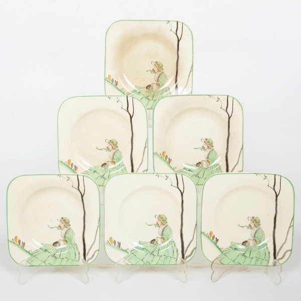 • FAIANÇA INGLESA, seis (6) pratos quadrangulares para bolo, ornamentação policromada com figura feminina e flores, marca WOODS YVORY WARE (usada nas décadas de 30 e 40 pela Wood & Sons, fundada em 1865, funcionou na Potteries New Wharf em Trent e mais tarde na Pottery Stanley em Burlem, fechou em 2005), possuem o craquelê característico do envelhecimento de toda a faiança, medindo 13,5 x 13,5 cm, sinais de uso, vide foto.