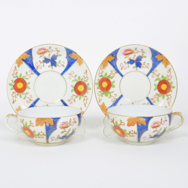• PORCELANA JAPONESA, par (2) xícaras para chá, ornamentação floral pintada a mão, padrão Imari, arremates a ouro, marca representada pela letra H dentro de losango envolto por silhueta de flor da cerejeira, ideais para coleção de cristaleira, vide foto.