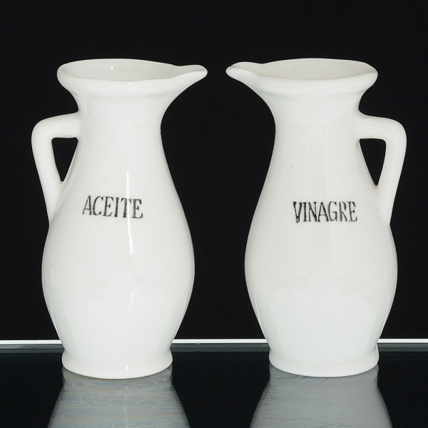 • PORCELANA, par (2) galhetas na tonalidade branca, com as legendas, ACEITE e VINAGRE, medindo 11,5 cmaltura, sinais de uso, vide foto.